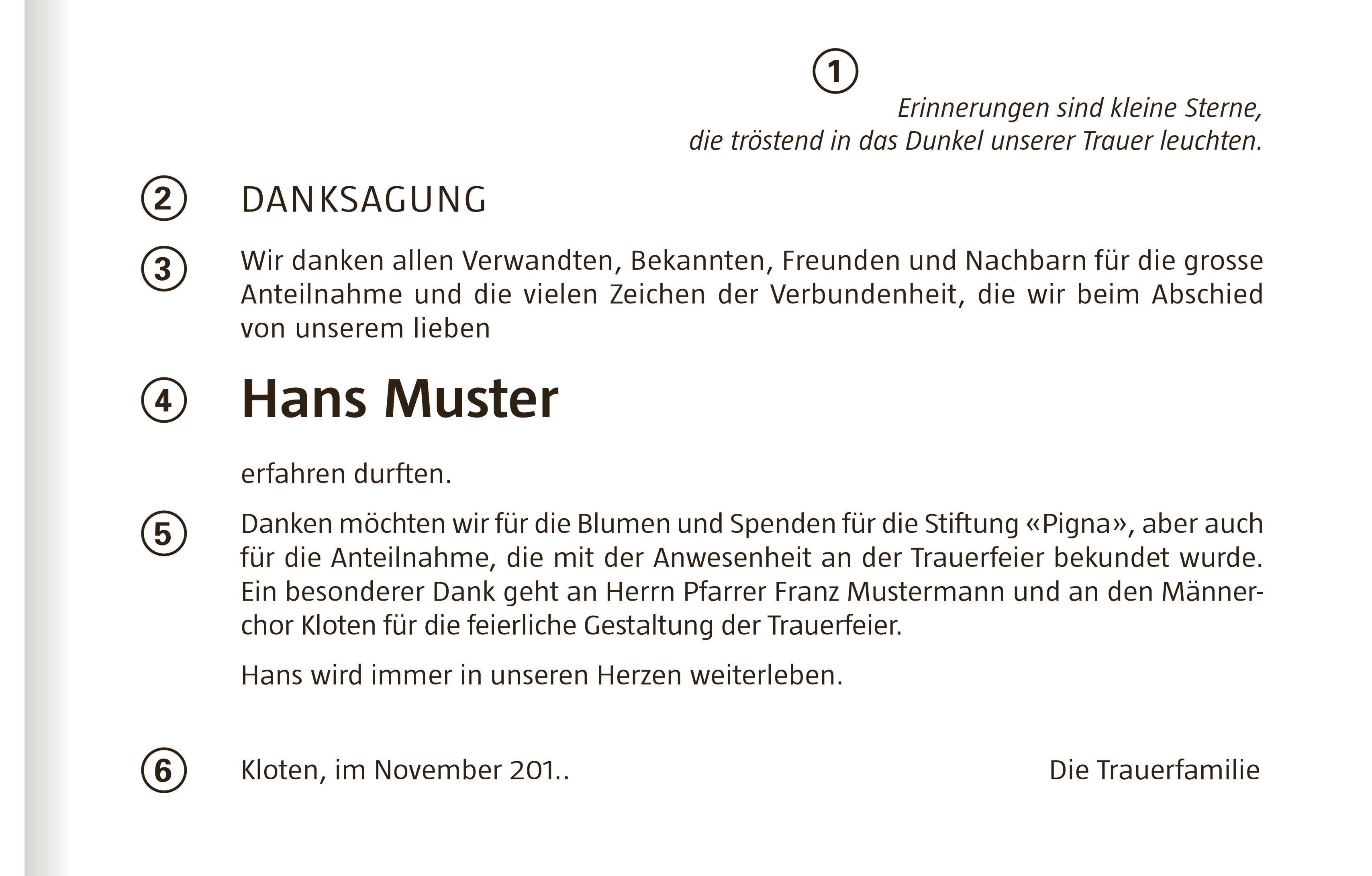 • Danken möchten wir auch herzlich für die wunderschönen Blumen, die Spenden für späteren Grabschmuck, die persönlichen Beileidsbezeugungen und die (zahlreichen/grosszügigen) Spenden an (Name).